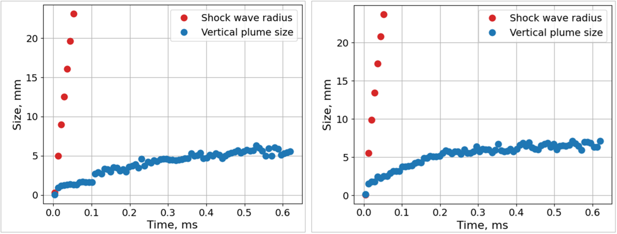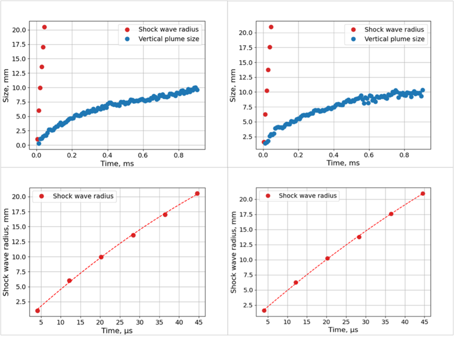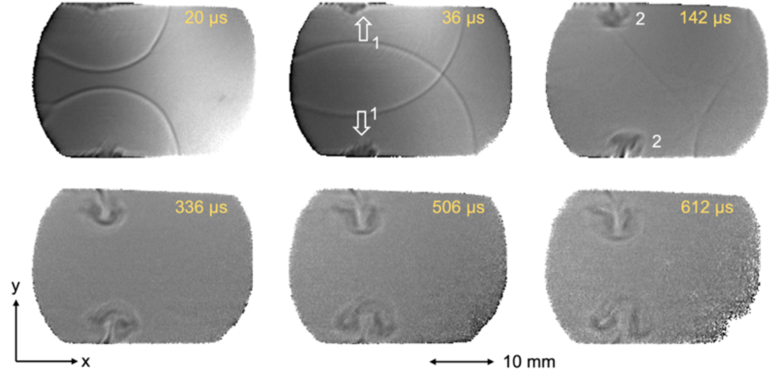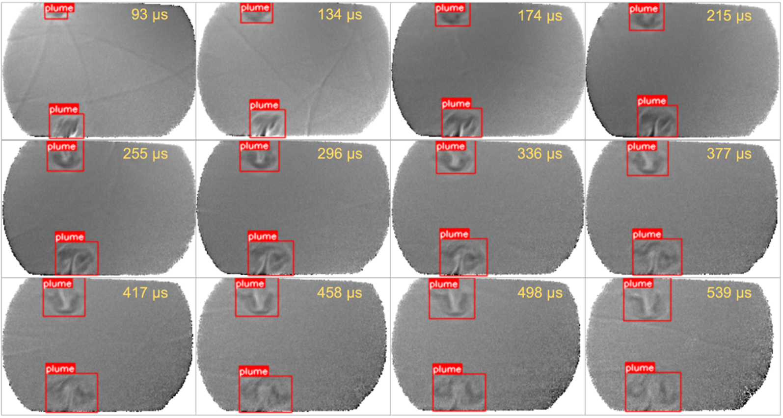 Проведено количественное исследование ударно-волнового течения, создаваемого в воздухе скользящим поверхностным разрядом длительностью менее микросекунды. Визуализация течения проводилась теневым методом, регистрация процесса велась со скоростью 124 000 кадров / с, экспозиция 1 мкс. Цель работы – исследование динамики возникающей при разряде цилиндрической взрывной волны и контактной поверхности. Каждый эксперимент позволял получить несколько сотен изображений нестационарного газодинамического процесса длительностью до 1 мс. Для определения положений разрывов обучена и применена сверточная нейронная сеть YOLOv8. Размечен набор данных, содержащий 984 разметки. Обученная модель по метрике mAP50 достигла 0.887, а mAP50-95 составила 0.557. С помощью модели автоматически измерялись вертикальные и горизонтальные размеры контактной поверхности. Она расширяется на временах до 0,4 – 0,8 мс до вертикального размера 5 – 11 мм. Измерялись x-t диаграммы и скорости цилиндрических взрывных волн. Показано, что при t < 1 мс основной причиной развития контактной поверхности является поток за фронтом взрывной волны. Показано, что применение компьютерного зрения позволяет значительно ускорить анализ высокоскоростной съемки течений и извлечение количественной информации.