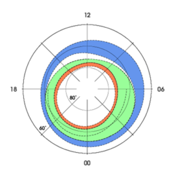 respectively. During periods of solar activity, the auroral oval expands and