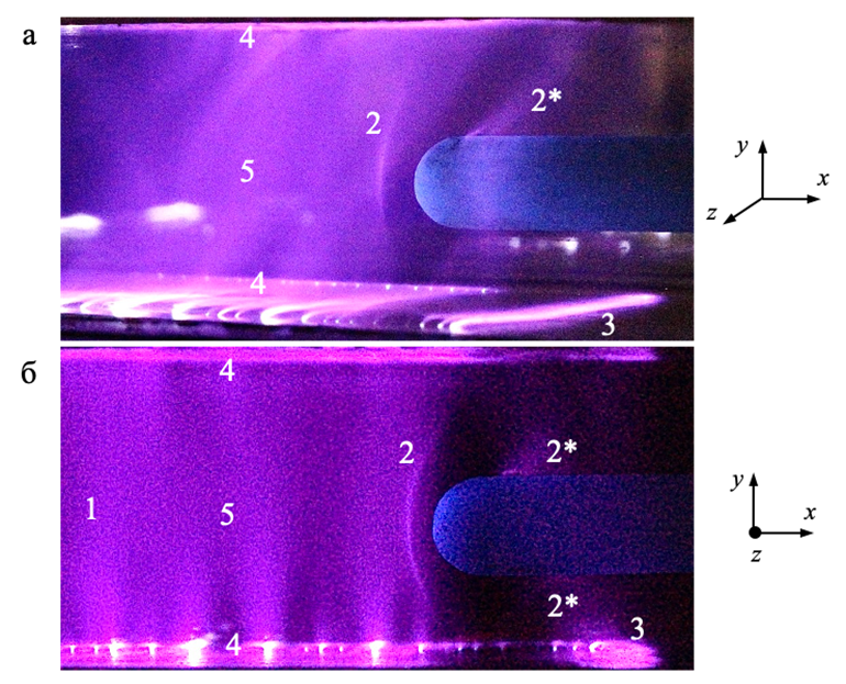 1 — поток, 2 — головная ударная волна, 2* — наклонные ударные волны, 3 — зона отрыва; 4 — свечение поверхностных скользящих разряды, 5 — объемное свечение.