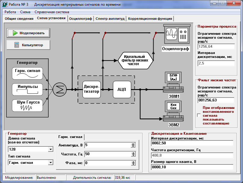 После ввода необходимых данных и параметров активируется кнопка «Моделировать». В результате на вкладках «Осциллограф», «Спектр амплитуд», «Корреляционная функция» и «Спектральная плотность мощности» будут построены смоделированный сигнал и его спектральные характеристики.